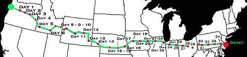 The planned route at the beginning of the ride worked out to 3,100 miles in 31 days or so.. These numbers changed by Atlantic city...